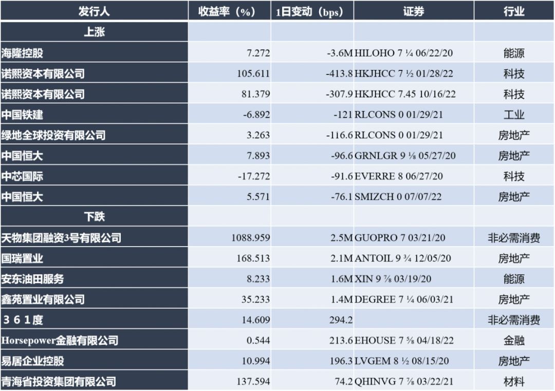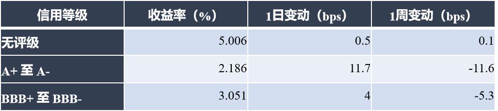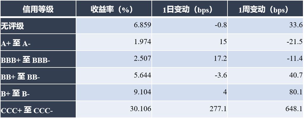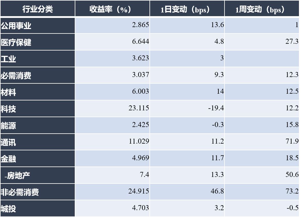 行业方面,科技板块领涨,非必需消费、材料板块领跌。科技板块主要受北大方正(诺熙资本)、中芯国际等名字上涨的影响,收益率下行约19.4bps;非必需消费板块主要受天物集团、361度等名字下跌的影响,收益率上行近46.8bps;材料板块主要受青海省投资集团等名字下跌的影响,收益率上行14bps左右。