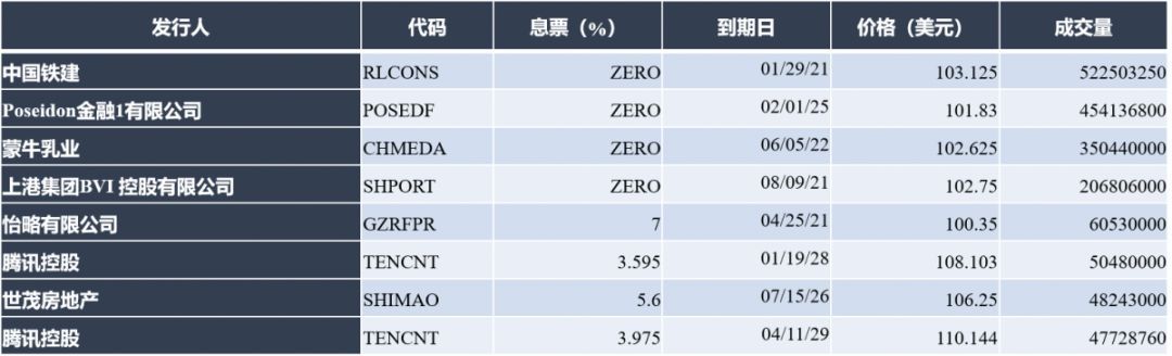 今日交易活跃债券名字RLCONS 0 01/29/21(中国铁建),POSEDF 0 02/01/25(Poseidon金融1有限公司),CHMEDA 0 06/05/22(蒙牛乳业)。