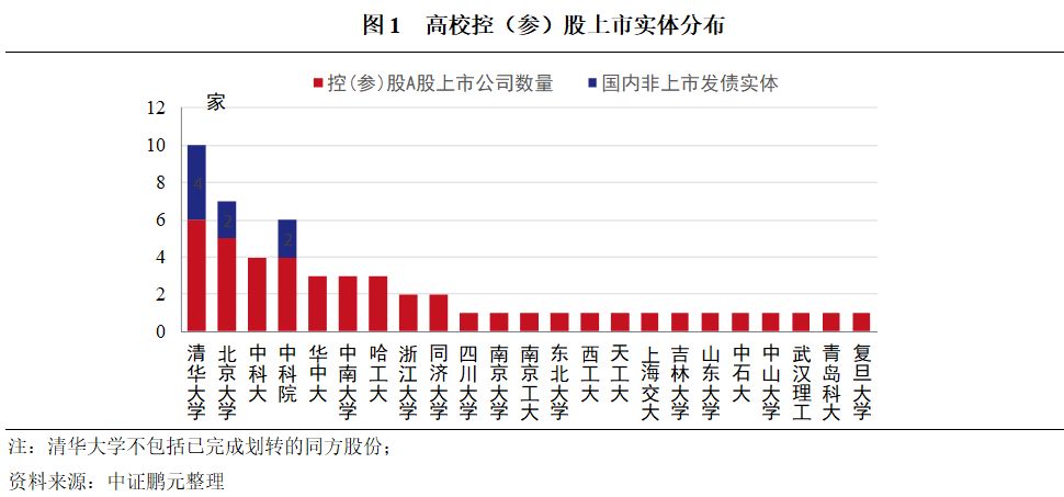 除北京大学、清华大学、中国科学院之外,其余各高校下只有1-3家控股企业为上市实体。