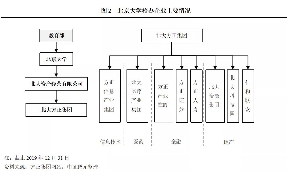 1986年,北京大学投资创办了北大方正集团前身——北京大学理科新技术公司,1992年北大方正集团(“方正集团”)正式成立。1998年,北大方正集团旗下的方正科技集团通过入主延中实业实现了向“方正科技”的转变。2002年,在校企改革的浪潮中,北京大学成立了北大资产经营有限公司(“北大资产”),对包括方正集团在内的多数北大校办企业进行集中管理,涉及产业和投资公司体系庞大、纷繁复杂,包括三四级在内的子公司上千家。方正集团及其控股企业是北大资产的核心部分,产业主要涉及信息技术、健康医疗、房地产、金融产业等。