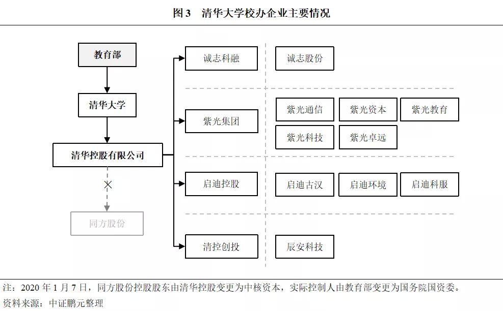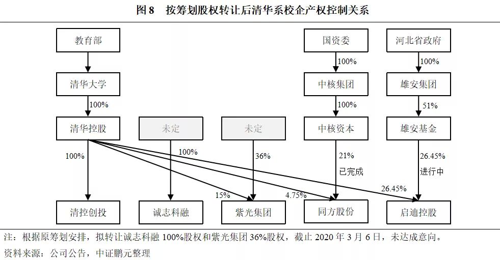 2018年5月,《高等学校所属企业体制改革的指导意见》提出了要“对高校所属企业进行全面清理规范,理清产权和责任关系,分类实施改革工作”。清华大学2018年下半年正式开始改革工作。2018年9月,清华控股与向苏州高新、海南联合签署《股权转让协议》,拟分别向上述公司转让所持紫光集团30%和6%的股权,10月终止了上述股权转让交易,并与深投控签署合作框架,转让紫光集团36%股权,2019年8月,清华控股终止与深投控的转让协议。2018年12月,清华控股与中核资本签署“合作框架协议”,拟转让所持同方股份21%股权,2019年4月双方正式签署《股权转让协议》;2019年9月,清华控股在北交所挂牌转让诚志科融100%股权。2019年11月,清华控股与雄安基金公司签订了《股权转让协议》,转让启迪控股的控股权。截止2020年3月6日,清华控股已完成了对同方股份的控股权转让,其余三家公司的控股权转让尚未完成。根据2019年2月校企改革提速的要求,清华控股可能会加速完成三家子公司控股权转让事项,完成之后,清华控股不再对其四家核心子公司并表。根据具体交易事项及安排,四家子公司实际控制人或变更为国务院或地方国资委、人民政府及其部门,国有性质不变。清华控股可能将仍保留清控创投的股权。