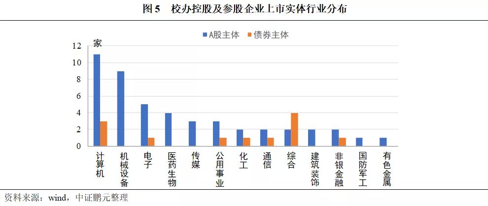 浙江大学、复旦大学、同济大学、山东大学等16所高校的校办企业对上市实体参股为主。江浙沪地区校办企业较为活跃,如浙江大学通过其全资国有资产管理公司浙大控股集团业务主要涉及科技转化、后勤服务、文化创意三大产业板,参股上市公司浙大网新、众合科技;复旦大学直接持有复旦复华18.74%股权,亦设立全资资产管理公司——上海复旦资产经营有限公司来推动科技成果产业化及孵化科技企业。上海交通大学、同济大学、南京大学等均通过其全资资产管理公司持股上市实体。华北及东北地区还包括东北大学、吉林大学、天津工业大学、山东大学、中国石油大学、青岛科技大学等校办企业;华南和西南地区包括中山大学、四川大学开办或投资企业;华中地区有中南大学、武汉理工大学开办或投资企业。