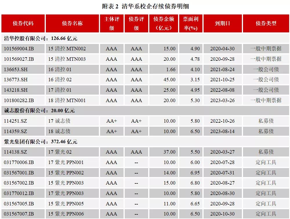 清华控股在国内债券市场发债主体有诚志股份、紫光集团、紫光通信、紫光国微、启迪控股、启迪科技、启迪环境等8家公司,实际控制人为教育部。截止2020年2月末,清华系校企合计存续债券52只,存续债券余额639.52亿元,其中紫光集团和清华控股的存续债券余额较大,分别为372.46亿元和126.66亿元,合计占比约78%。清华系校企在境内外未有违约事件发生,但清华控股在第二阶段的校企分置改革过程中,正筹划旗下紫光集团、启迪控股、诚志股股份等核心控股企业股权转让事项。2020年1月7日,清华控股已完成向中核资本转让其持由的同方股份21%股份的过户手续。