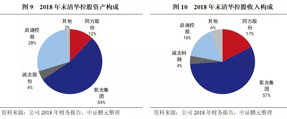 1988年,清华大学成立大学科技开发总公司(紫光集团前身),1993年正式组建紫光集团,随后在1997年成立了同方股份,2000年成立了启迪控股。2001年,清华大学试点改革,对存续企业进行资产理清,2003年清华大学成立了全资公司清华控股有限公司(“清华控股”),将原旗下产业整合并入清华控股统一管理。清华控股主要涉及的产业领域包括信息技术(集成电路)、能源环保、创新服务、科技金融、高科技企业孵化、在线教育等。清华控股直接控制企业21家,其中同方股份、紫光集团、启迪控股、诚志科融四大综合性集团为清华控股的核心子公司,四家企业在清华控股的资产和收入占比均在90%以上。此外还包括清控人居、博奥生物、清控资管、清控核能、慕华教育等专业性集团子公司。