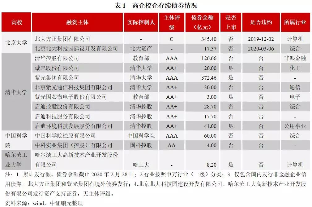 高校企业债券融资现状:校办(控股或参股)上市实体以股权融资为主进行,债务融资的主体仅有13家,其中北大(2家)、清华(8家)、中科院(2家),哈工大(1家)等4所高校的校办企业,其中主要为清华系企业。