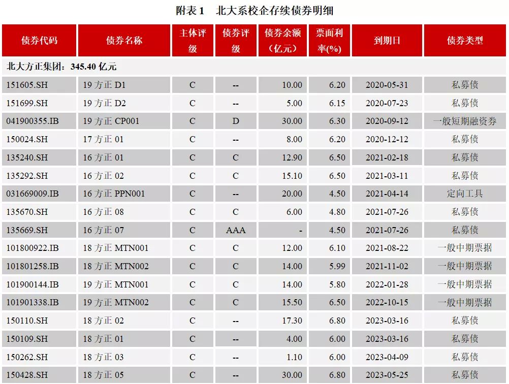 北大资产经营有限公司(“北大资产”)在国内债券市场发债主体有方正集团以及北大科技园[2]共2家企业,根据公司披露资料,实际控制人为教育部,控股股东为北大资产。截止2020年2月末,方正集团仍有存续债券24只,存续债券余额345.40亿元,因2019年12月2日“19方正SCP002”未能偿付本息构成实质性违约,其主体评级经多次下调至C级。北大科技园在2018年4月发行了1期资产支持票据,北大资源和方正集团作为差额补足任何保证人,截止2020年2月末,存续债券余额17.57亿元。在方正集团违约事件中,北大科技园亦未能免于其影响,其优先级“18北大科技ABN001优先级”评级亦下调至B+,2020年3月6日因未履行回售义务而实质性违约。