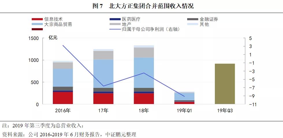 方正集团行业分散、整体盈利质量不佳,不断扩大的负债投资并未带来明显的投资回报。方正集团经营范围主要分布在信息技术、医疗医药、金融证券、大宗商品贸易、产业地产等业务,分别通过北大信息产业集团和中国高科、北大医疗产业集团、方正证券和方正人寿、北大方正物产集团、北大资源集团和北大科技园运营,其中信息技术、医疗医药两大领域是方正集团的核心业务领域,大宗商品贸易用于提供给现金流支持。根据方正集团2018年年报显示,方正集团年末合并范围资产规模3,606.14亿元,所有者权益654.79亿元(其中少数股东权益467.27亿元),实现年营业收入1,332.74亿元,利润总额41.80亿元,净利润14.94亿元。分业务板块来看,大宗商品贸易、信息技术、产业地产、金融证券、医药医疗收入分别占比51.20%、18.57%、17.46%、2.73%、2.40%,毛利率-0.38%、7.68%、32.36%、32.85%、11.70%。其中信息技术作为起家业务2016-2018年收入持续下降,部分板块业务亏损;医药医疗板块盈利虽然增长,但创收能力弱;贡献近一半收入的大宗商品贸易业务盈利能力弱,所能带来的经营性净现金流有限。2019年1-6月,方正集团合并口径营业利润-6.72亿元,净利润-10.47亿元,亏损均较2018年同期有较大幅度的扩大。