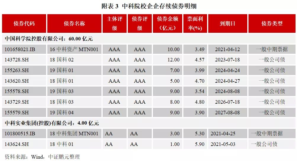 截止2020年2月末,发行债券的中科院下属企业有国科控股和中科实业两家,存续债券共9只,存续余额64亿元,存续规模较小,本年度无到期债券。