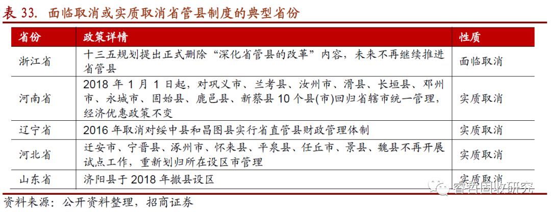 1)第一类原因为“撤销省管县,做强地级市”。以浙江省为例,2015年底,国务院要求住建部、发改委等19个中央部委,联合启动全国城镇体系规划,选拔10个国家中心城市、100个国家区域中心城市、1000个中小城市、10000个特色镇。浙江省为提升中心城市竞争力,随后的十三五规划中提出要正式删除“继续深化省管县改革”内容,且未来不再继续推进。