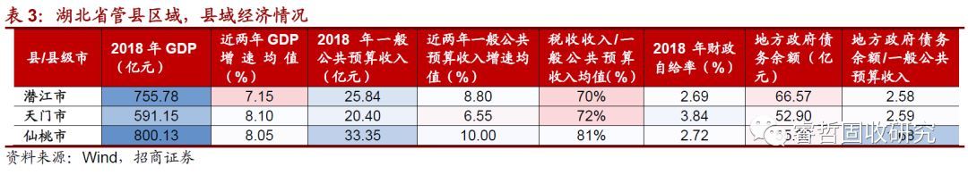 湖北省下辖的省管县内目前共有三家发债平台,分别为潜江城投,天门城投和仙桃城投。从县域经济情况来看,三个县级市的GDP排名在所有样本中均非常靠前,虽地方政府债务余额偏高,但一般公共预算收入覆盖能力好于其他区域。