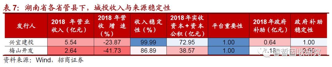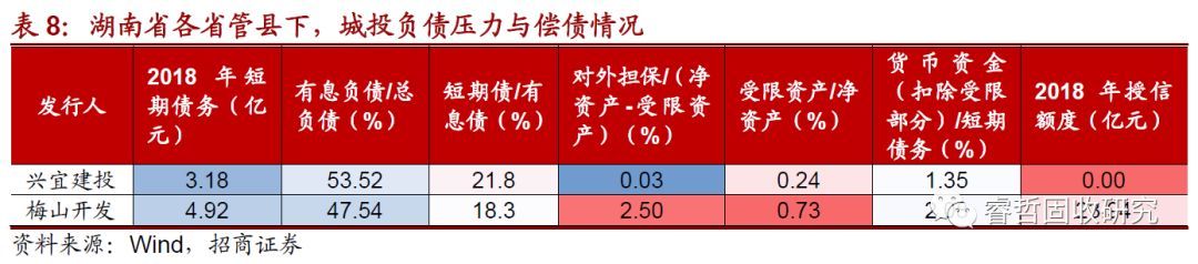 从发债城投自身财务数据来看,梅山开发的多个指标均偏弱,且2018营收增速为-41.73%。而兴宜建投在营业收入,和对外担保两个指标上相对梅山开发略好,但信用资质亦表现一般。