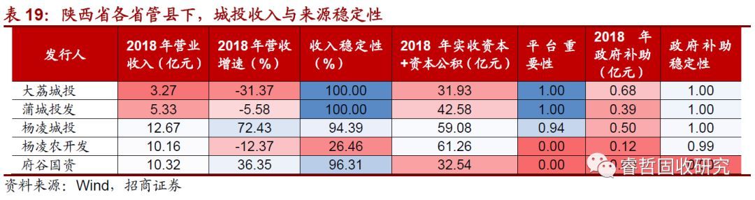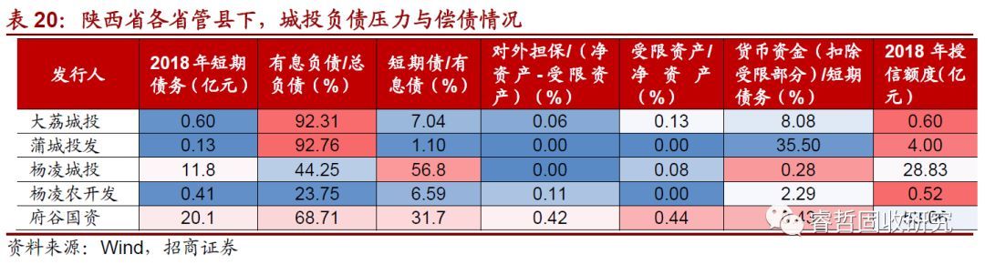 从发债城投自身财务数据来看,蒲城投发收入来源稳定,且不存在对外担保和受限资产,授信额度足够覆盖短期债务,担保与偿债指标状况良好;大荔城投与杨凌城投各指标总体略弱;杨凌农开发和府谷国资则在涉及稳定性的指标一般。