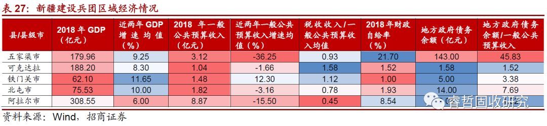 新疆建设兵团目前共有七家发债平台,分别为蔡家湖公司,农四师国资公司,绿原集团,国恒投资,阿拉尔新鑫,十师国资和阿拉尔统众国资。从县域经济表现上看,新疆有多数区域的指标表现一般,GDP总量处于所有省管县样本的下游。