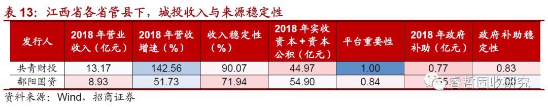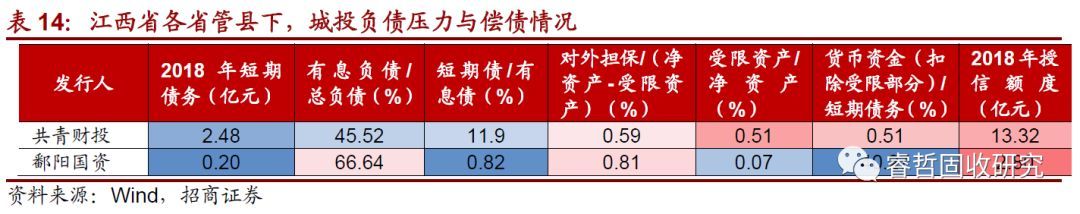 从发债城投自身财务数据来看,共青财投与鄱阳国资在收入稳定性和担保偿债方面均表现不错,债务方面共青财投短期债务占比稍大。