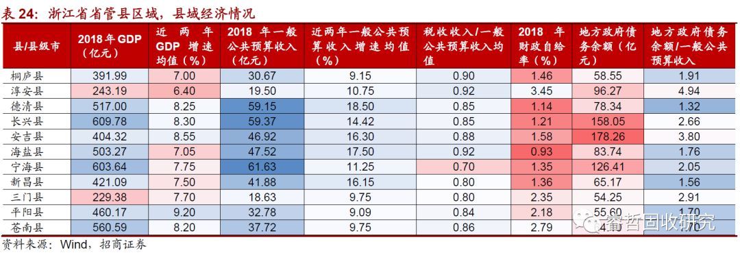 从县域经济情况看,除淳安县、三门县在GDP,财政自给率和债务指标上表现不佳,其余各县均表现强劲。综合来看,长兴、海盐、宁海、平阳、苍南五县区域经济表现好;桐庐、安吉、新昌三县紧随其后;三门县表现一般,淳安县表现较弱。
