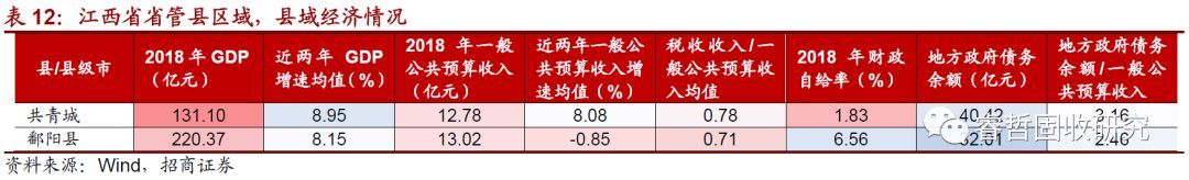 江西省下辖的省管县内目前共有两家发债平台,分别为共青财投和鄱阳国资。从县域经济情况看,两地GDP和税收等表现均一般,且共青城财政自给率较差。不过,两地在债务余额相关的两个指标上表现稍好。