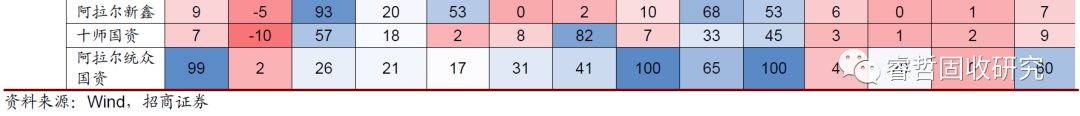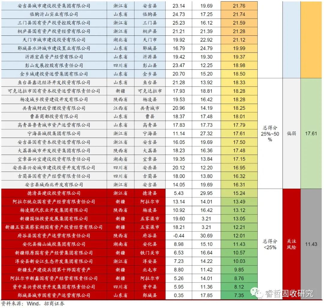 2)如何分类风险?其一,转换成百分制后,根据上述分类权重,进一步计算加权平均得分。由此得到“平台得分”和“区域得分”两类指标,而后根据前者60%和后者40%的权重,计算最终加权平均总分。其二,将各平台得分降序排列,按照不同分位数划分四类风险区间。从结果来看,浙江省多家县域平台靠前,不仅与平台资质的贡献有关,地方支持亦产生正向影响,新昌县和长兴县多家平台表现尚佳。不过,浙江省德清县平台资质偏弱,对总体得分产生拖累,进入“关注风险类”区域。另一方面,新疆多个县(级)市平台集中在下游区段,主要与地方经济的拖累有关。