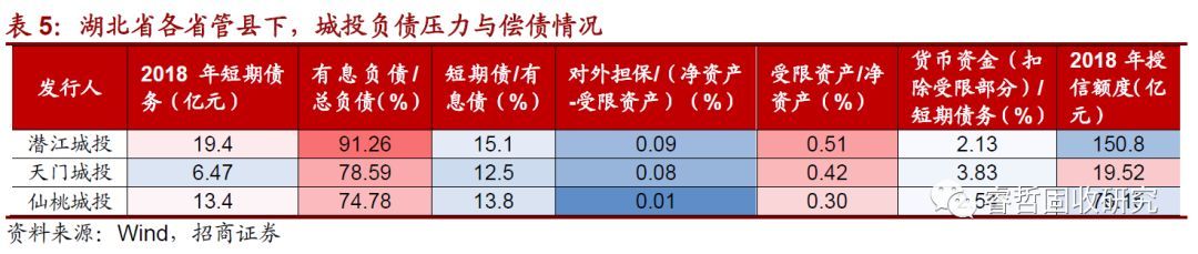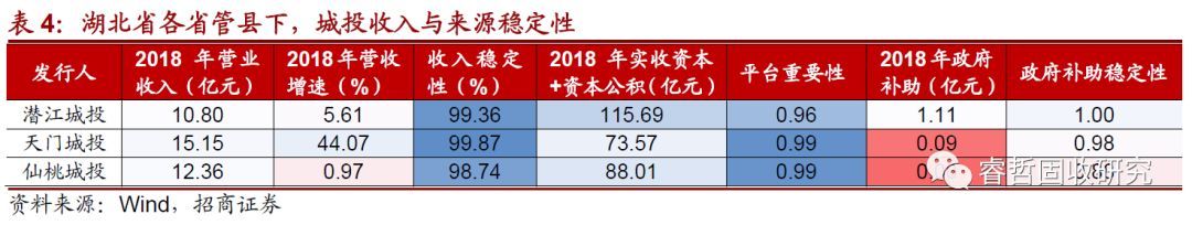 从发债城投自身财务数据来看,潜江城投财务情况好,政府补助稳定,负债尚可,偿债能力强;天门、仙桃城投财务情况弱,政府补助力度偏低,授信额度低于潜江城投。