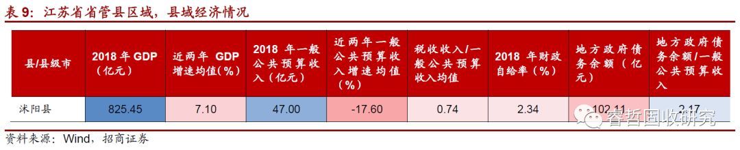 江苏省下辖的省管县内目前共有一家发债平台,名称为金源资产。从县域经济情况来看,沭阳县2018 年GDP在样本中排名最高,一般公共预算收入也居样本前列,但要注意的是,一般公共预算收入增速有降低的趋势。此外,虽沭阳县地方政府债务余额大,但政府收入对其覆盖能力较强,总体来说县域经济情况不错。