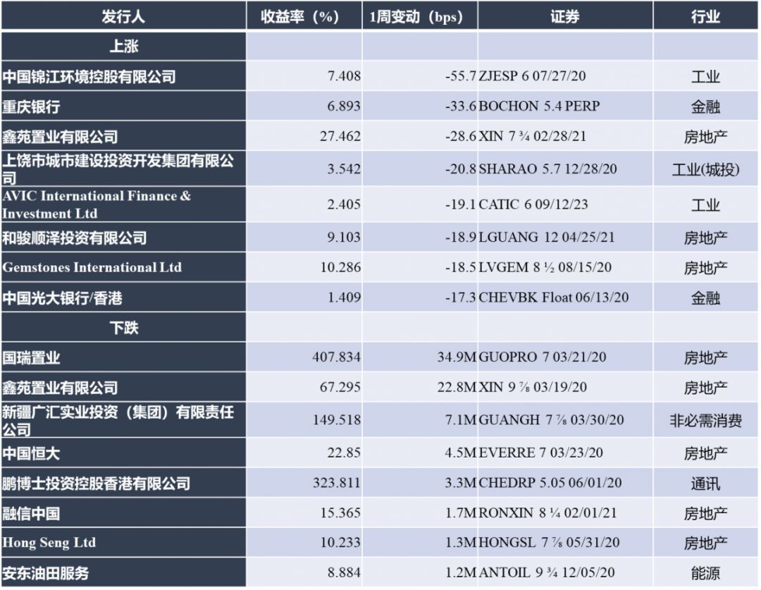 指数方面,中资美元债总回报指数(Bloomberg Barclays)较上周跌3.44%,中资美元债回报指数(Markit iBoxx)较上周跌3.24%,投资级回报指数(Markit iBoxx)较上周跌2.68%,高收益回报指数(Markit iBoxx)较上周跌4.50%。