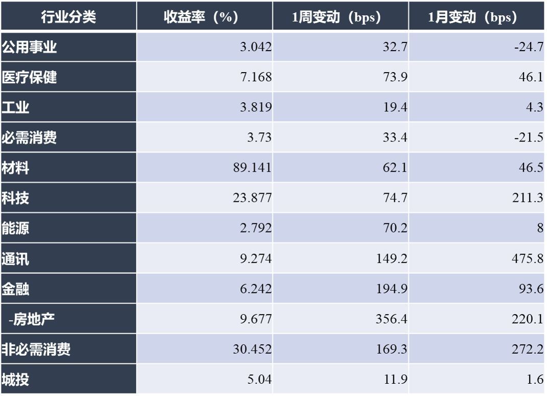 各等级名字不同幅度下跌,高收益名字跌幅最为明显,其中BB和B等级收益率分别上行约190.1bps、397.2bps,CCC等级收益率上行近3Mbps;无评级名字次之,收益率上行约89.9bps;投资级名字跌势稍缓,A、BBB等级收益率上行30.1bps~36.6bps左右。