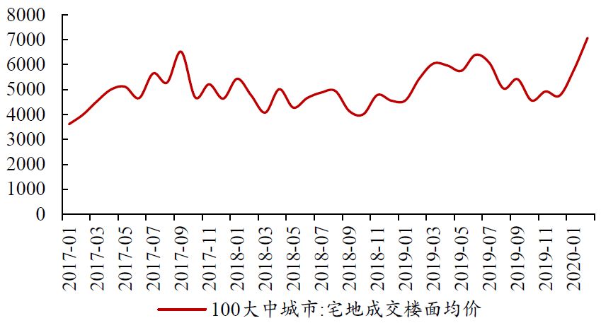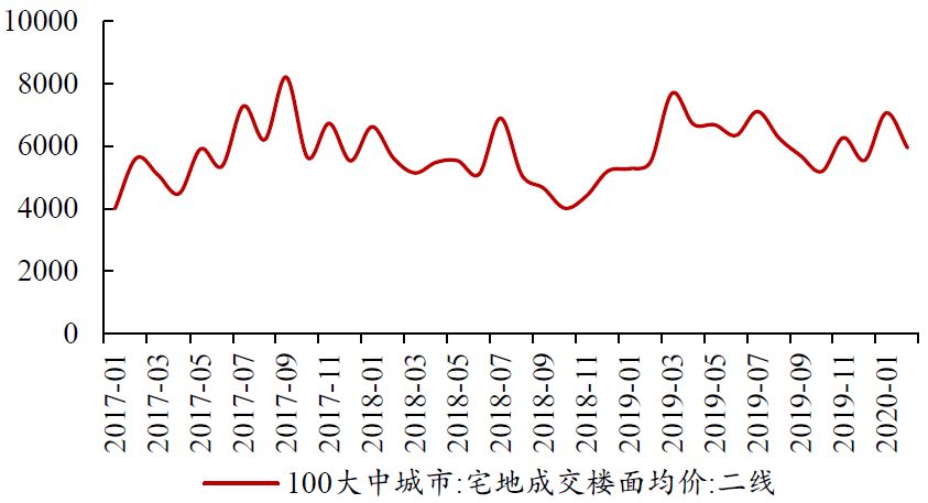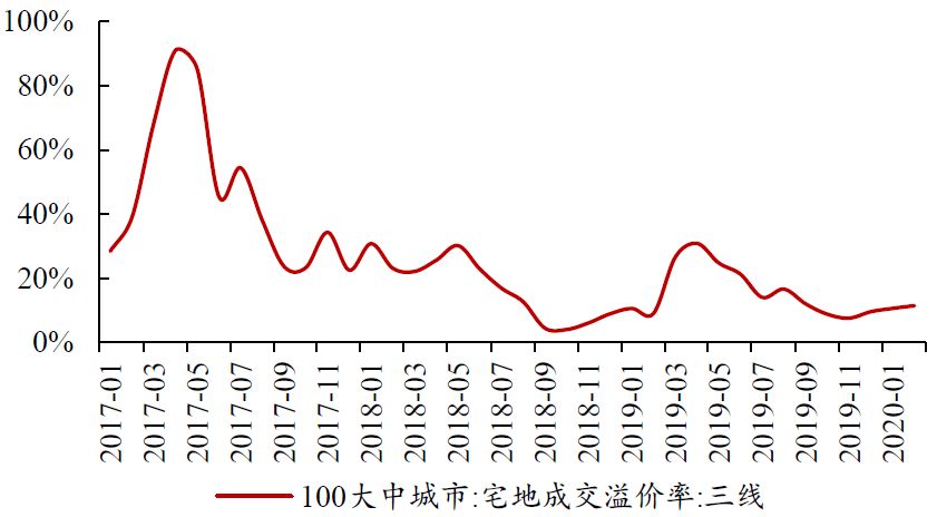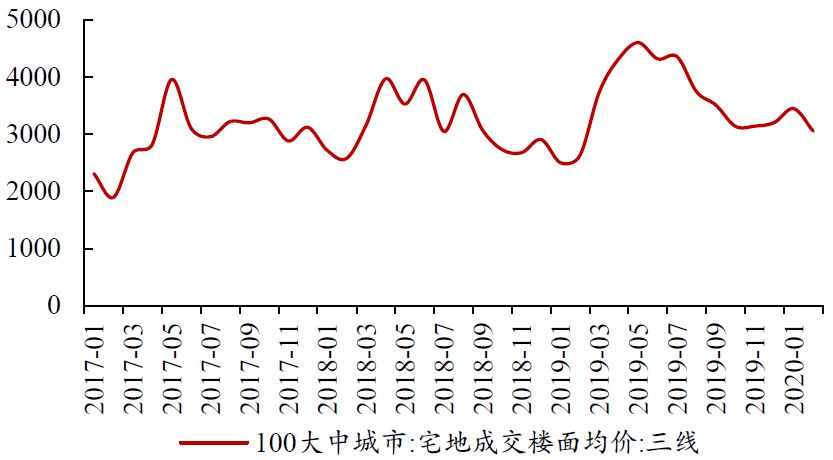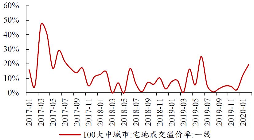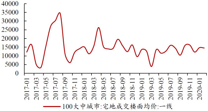 住宅类用地成交楼面均价环比明显上升,百城成交溢价率整体回落。100个大中城市住宅类用地成交楼面均价在2019年上半年出现上升态势,下半年出现明显回落,今年2月环比明显上升,主要系成交结构中一线占比明显提升;各线城市成交楼面均价走势较为平稳。溢价率方面,百城住宅类用地成交溢价率在2019年四季度降至低位,近期出现了明显上升,一线城市升幅较为明显,表明房企对于土地的争夺较为激烈,反映出开发商对后市较乐观的预期。