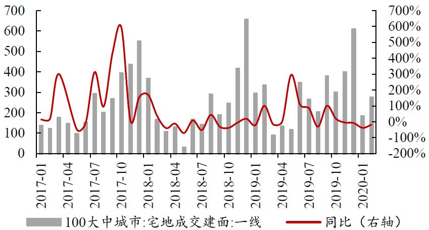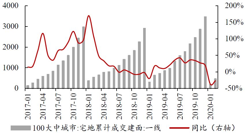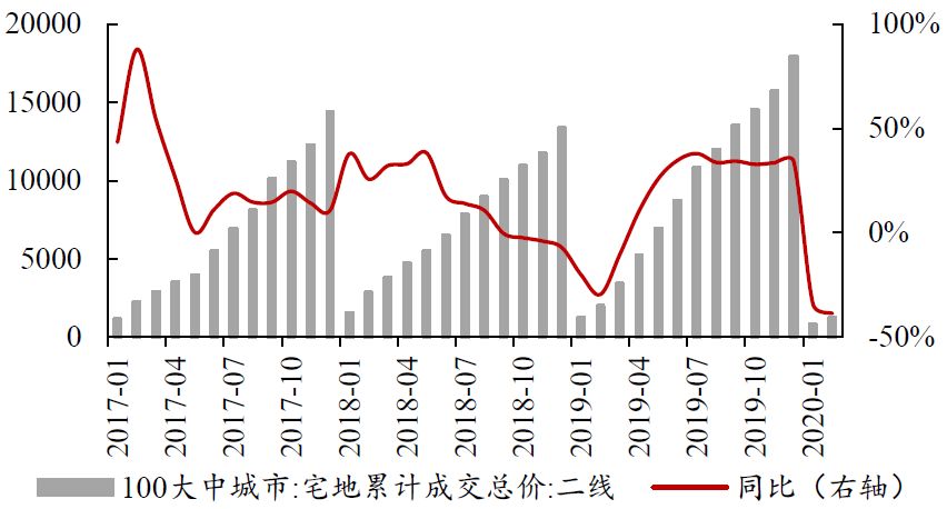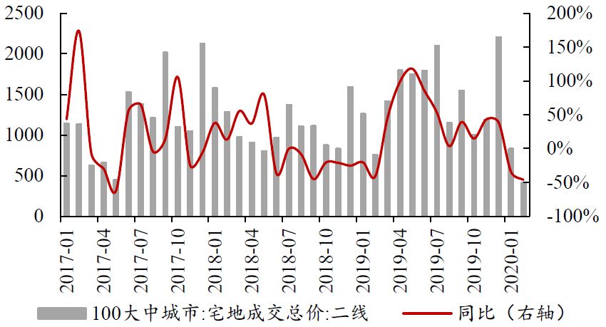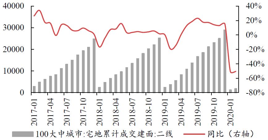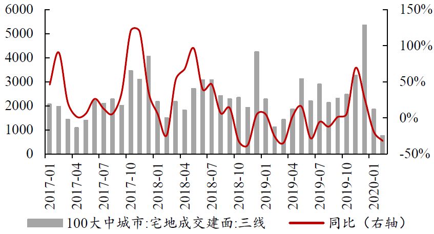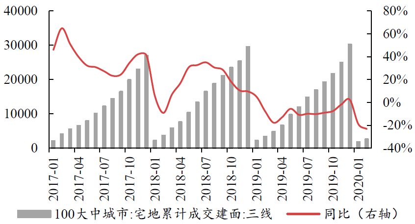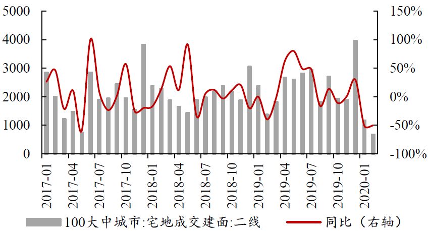 疫情之下,各线增速普遍回落。2月,100个大中城市住宅类用地成交建面同比下滑约39.3%,上月为下滑35.4%;分线来看,一线城市单月同比下滑17.7%,二线城市同比下滑50.2%,三线城市同比下滑32.2%。累计成交建面方面,1-2月100个大中城市住宅类用地累计成交建面同比下滑约36.8%,上月为下滑35.4%;分线来看,一线城市累计同比下滑26.9%(上月下滑37.5%),二线城市累计同比下滑50.6%(上月下滑50.8%),三线城市累计同比下滑23.3%(上月下滑18.9%);各线增速普遍回落。