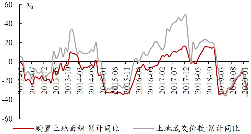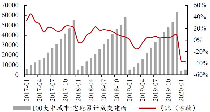 投资增速明显转负,土地购置降幅扩大。受疫情冲击影响,1-2月,全国房地产开发投资完成额累计同比下降约16.3%(去年全年为增长9.9%),地产投资增速近年来首次转负。拿地方面,土地供给的减少与经济活动的停滞使得房企前2个月土地购置力度明显下降,1-2月购置土地面积与土地成交价款分别累计下滑29.3%与36.2%(去年全年分别下降11.4%和8.7%),降幅明显扩大。土地购置费去年全年同比增长14.5%(2018年全年:+57.0%),增速持续下滑;由于土地成交价款是土地购置费的领先指标,预计土地购置费增速将继续小幅下滑,进而影响全年房地产开发投资增速。整体而言,2月投资和拿地数据符合预期,后期将随经济活动恢复而出现反弹。