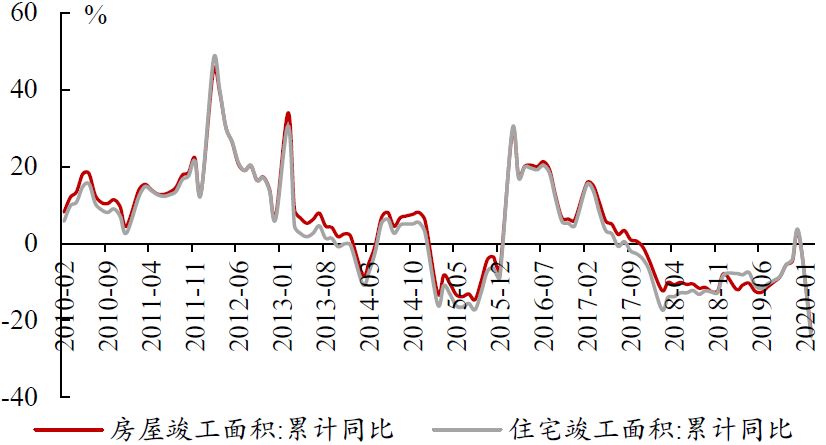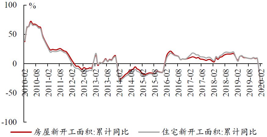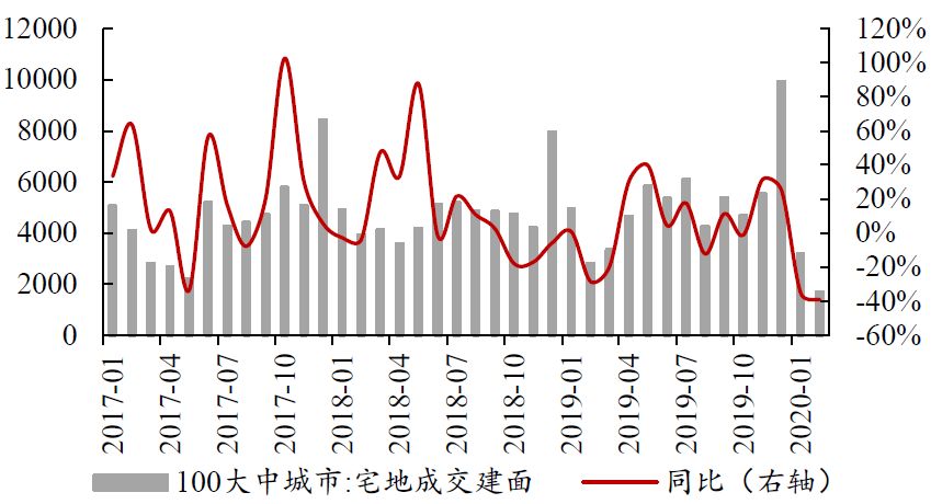 新开工同比大幅下滑,竣工面积增速再次转负。受前期停工停产等防控措施的影响,房企1-2月新开工面积出现明显的下降,房屋新开工面积同比累计下降44.9%(去年全年为增长8.5%)。房屋竣工面积1-2月累计同比下降22.9%,增速再次转负。由于新开工面积仍大于竣工面积,1-2月房屋施工面积同比小幅增长2.9%。新开工面积的大幅下降或将对短期市场供给造成一定影响,预计未来一段时间房企库存将持续去化,补库存压力或将使得土地市场竞争更趋激烈。