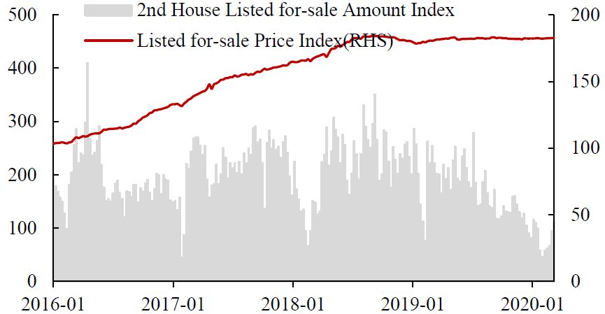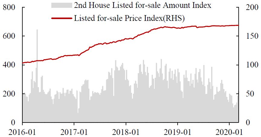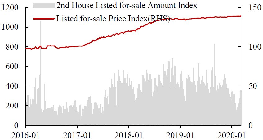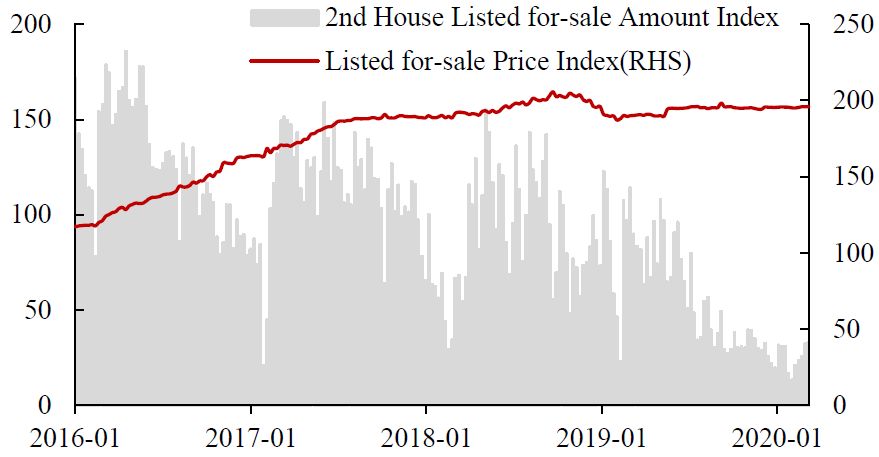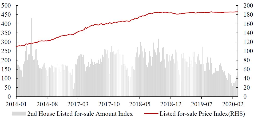 疫情之下销售遇冷,推盘同比明显下滑。2月,45城新房成交量环比下降77%,同比下降71%;当年累计成交量下降38%(上月下降15%),一、二、三线城市分别下降34%、31%及45%。肇庆、湛江、南京和金华累计增幅较大,而长春、泉州、淮南、吉林累计降幅较大。截至2月末,14城新房去化周期为70.2个月,平均环比上升378%,同比上升255%。二手房方面,2月,15城二手房交易量环比下降79%,同比下降68%;截至2月末,15城累计交易量同降30%(上月降7%)。金华、深圳、青岛二手房成交面积累计增幅居前。三四线二手房挂牌量指数维持高位,各线城市挂牌价指数止涨后保持稳定。