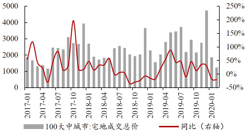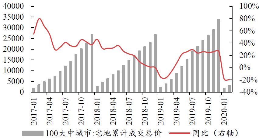 图29:1-2月百城宅地成交总价同比下降19.6%