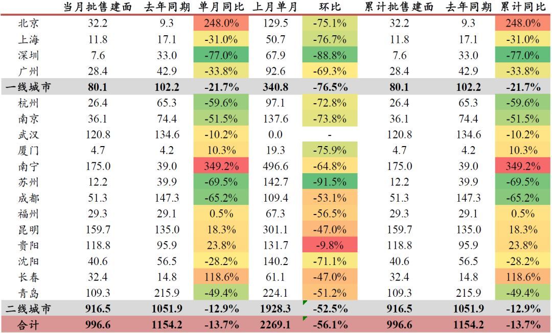 南宁、北京、长春和贵阳新房批售面积累计同比增幅较大,新增供应相对充足。受疫情影响,多数城市2月几乎无新增商品房批售。1月17个重点城市单月新房批售建面为996.6万平,同比下降13.7%,环比下降56.1%;其中,4个一线城市单月同比下降21.7%,环比下降76.5%,13个二线城市单月同比下降12.9%,环比下降52.5%。南宁、北京、长春和贵阳批售建面单月同比增长349.2%、248.0%、118.6%和23.8%,新增供应相对充足。(注:因数据可得性,苏州、昆明和贵阳为商品房批准预售建面,其余城市为商品住宅口径)