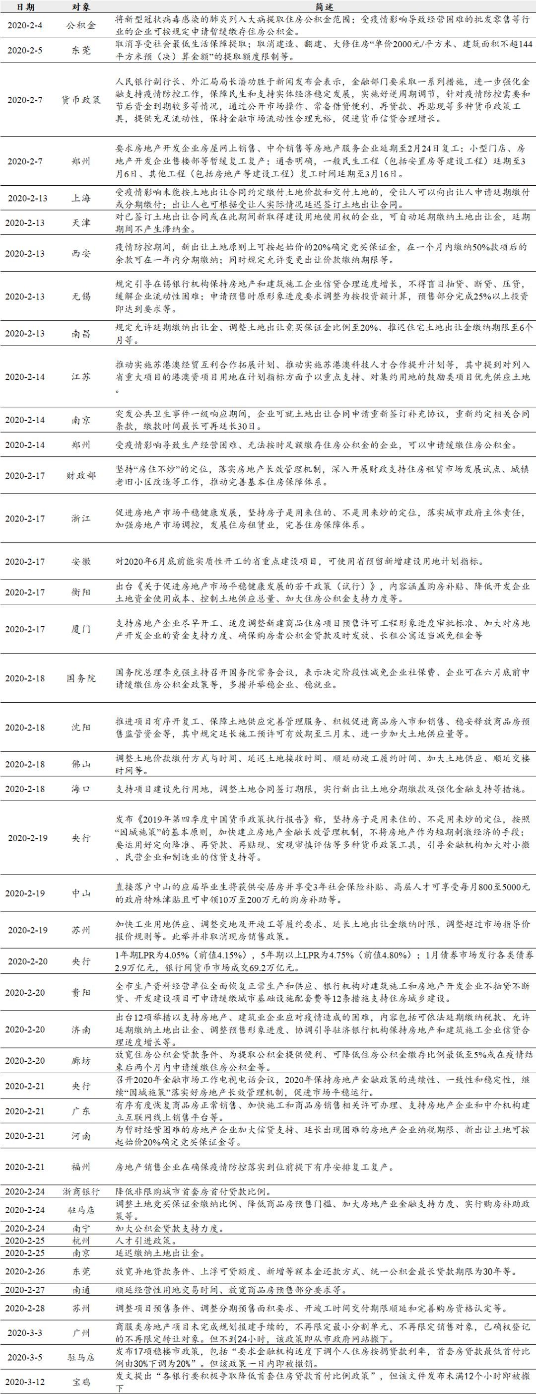 多地加大政策微调力度,但“房住不炒”大框架突破概率不大。2月以来,各地通过“一城一策”预调、微调政策的频次明显加大,如济南、西安、杭州、天津等十余城为应对疫情,明确土地款可申请延期或分期缴付;黄山、苏州等地修改土地要求现房销售的政策,适度放宽楼盘的预售条件等。值得关注的是,驻马店、广州、宝鸡等城市有关降低首付比、放松商办类销售限制等政策在发布后不久即被撤销,表明当前大幅度突破“房住不炒”框架的概率不大。我们认为,在“房住不炒”思路指导下,各地微调政策的频次和力度或将加大,而房地产行业基本面有望得到一定支撑。