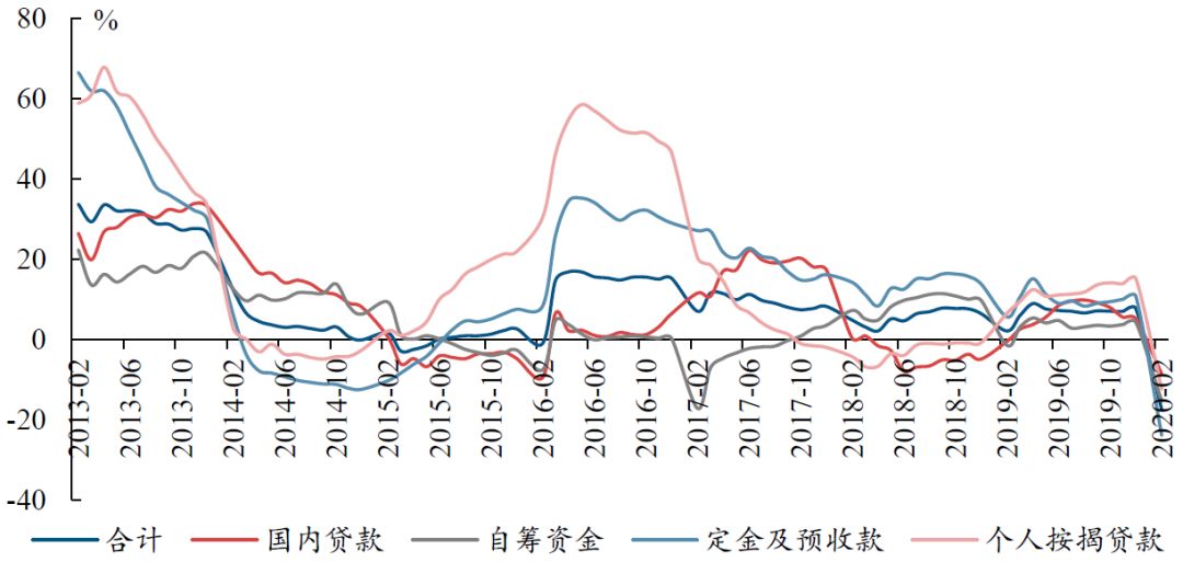 开发资金来源同比下滑,定金及预付款增速降幅明显。1-2月,房地产开发资金来源累计同比下降17.5%(去年全年增长7.6%)。拆分来看,国内贷款累计下降8.6%(去年全年为增长5.1%);自筹资金累计同比下降15.4%(去年全年增长4.2%);定金及预收款、个人按揭贷款累计同比下滑23.9%和12.4%(去年全年分别增长10.7%和15.1%)。由于商品房销售出现一定停滞,房地产开发资金来源中的定金及预收款和个人按揭贷款降幅较为明显。随着房地产销售活动的逐步恢复,房企开发资金来源也将得到一定改善。