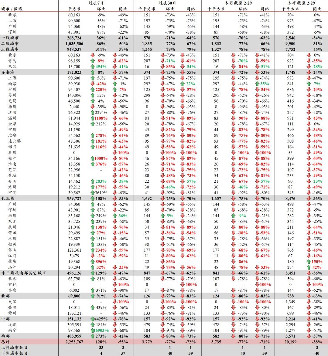表 1:截至2/29主要城市交易量,各线城市同比均有明显下滑