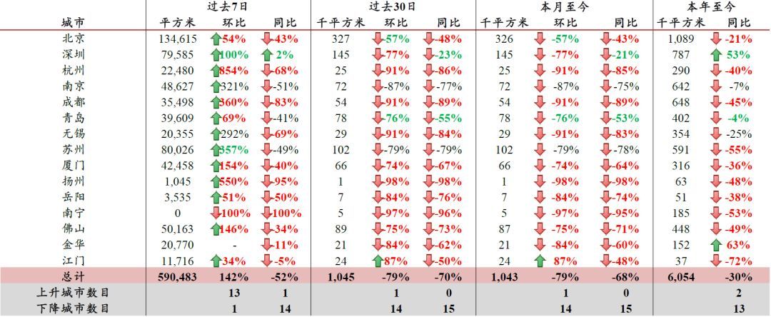 去化周期按月明显上升,一线城市中北京、上海环比上升较快。截至2月末,14个主要城市的可售面积(库存)环比上月平均下降1%,同比平均上升8%;平均去化周期为70.2个月(上月为16.9个月),环比平均上升378%,同比平均上升255%。北京、上海、广州、深圳去化周期分别为20.4个月、9.7个月、51.0个月和30.4个月,环比上月分别上升251%、292%、139%和228%;同比分别上升108%、320%、151%和33%。整体而言,疫情带来的销量下滑使得主要城市去化周期明显上升。