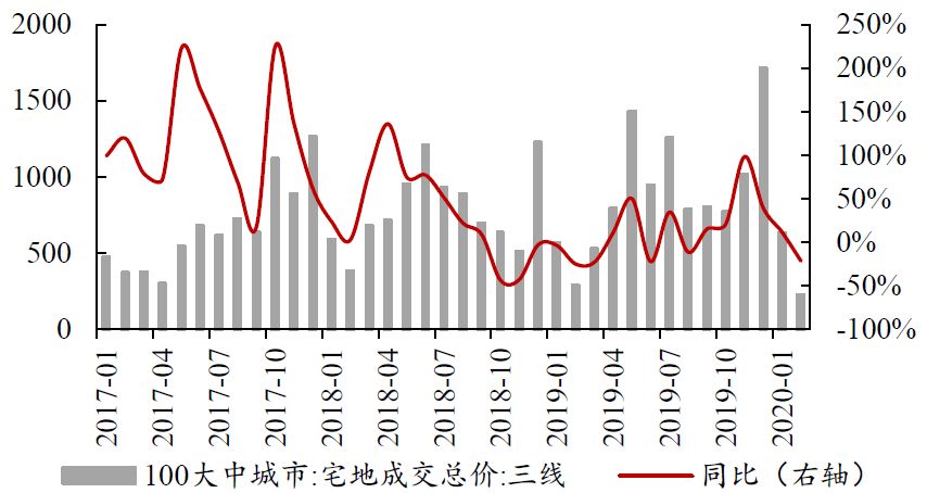 图28:2月三线城市住宅用地成交总价同降21.1%