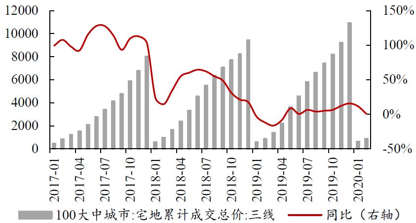 图32:1-2月三线城市宅地成交总价同比上升0.6%