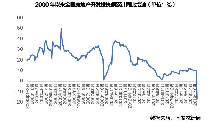 自2000年以来,房地产开发额累计同比增速的变化情况基本呈现出周期性的波动上升或下降。从下图中可以看出,出现“断崖式”下跌的两个年份是2003年和2008年,但即便在2003年非典,2008年金融危机,房企的开发投资额累计增速也从未降至负值。