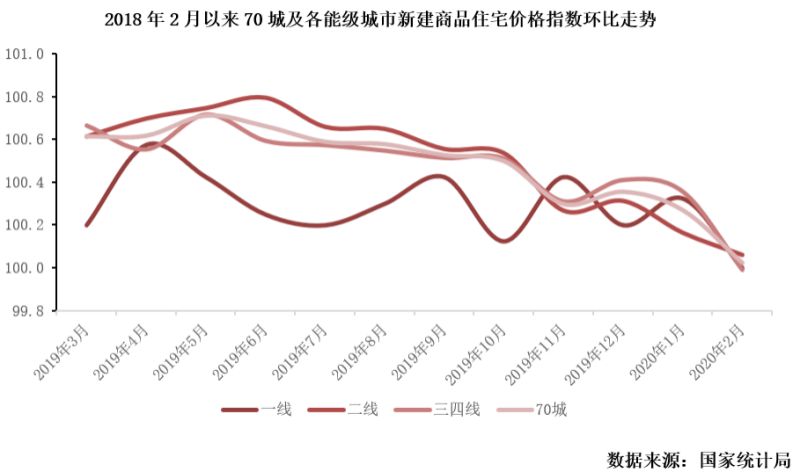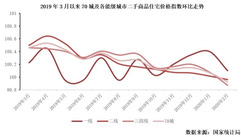截至2020年2月底,一、二、三线城市新房及二手房销售价格无论同环比均呈现涨幅持平或回落趋势。具体来看,新房价格环比整体持平,微增0.02%;新房价格整体同比上涨3.1%,其中,一线城市上涨2.2%、二线城市上涨3.0%、三四线城市上涨3.3%。